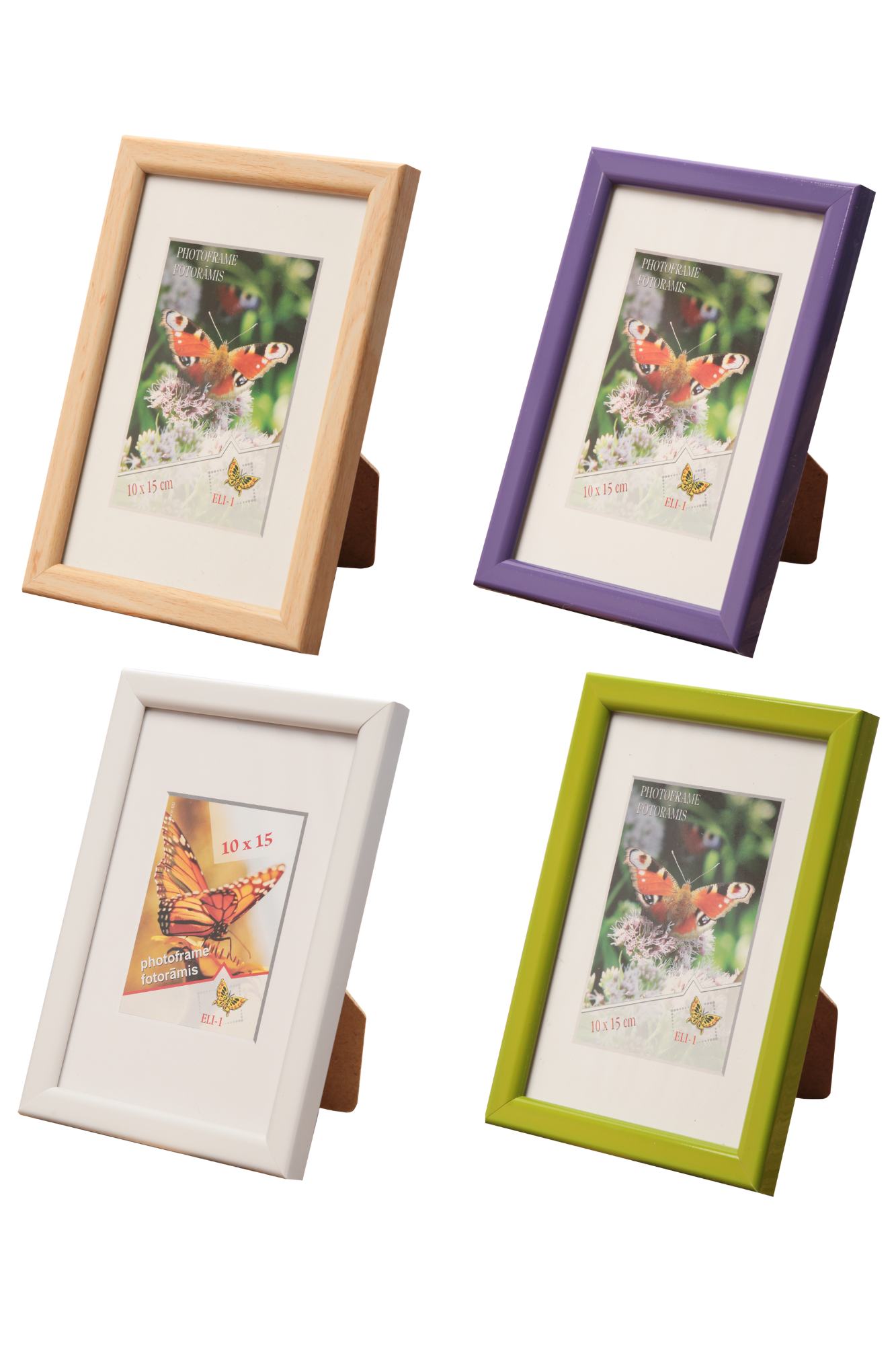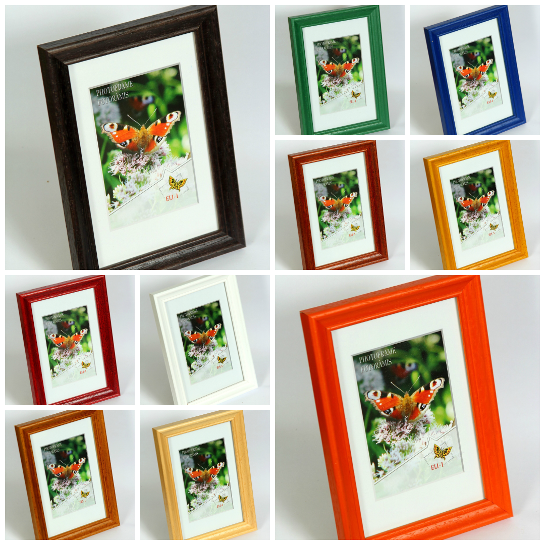 Foto rāmis 15x21cm (A5 formāts), koka rāmis ar stiklu vai plastmasu, ar kājiņu, novietoanai uz galda vai stiprināms pie sienas. Pamatne no kartona. Krāsas daādas.